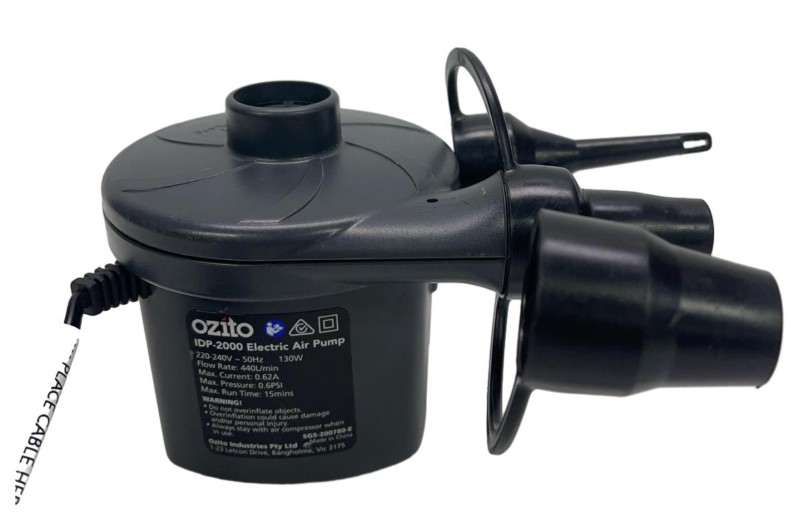 This compact and powerful electric air pump from OZITO is perfect for inflating and deflating camping mattresses, air beds, and other inflatables with ease. Featuring a robust 130W motor, it can inflate a queen-size air mattress in under 3 minutes. The ergonomic design and included nozzle adapters make it a versatile and convenient option for all your camping and travel needs.