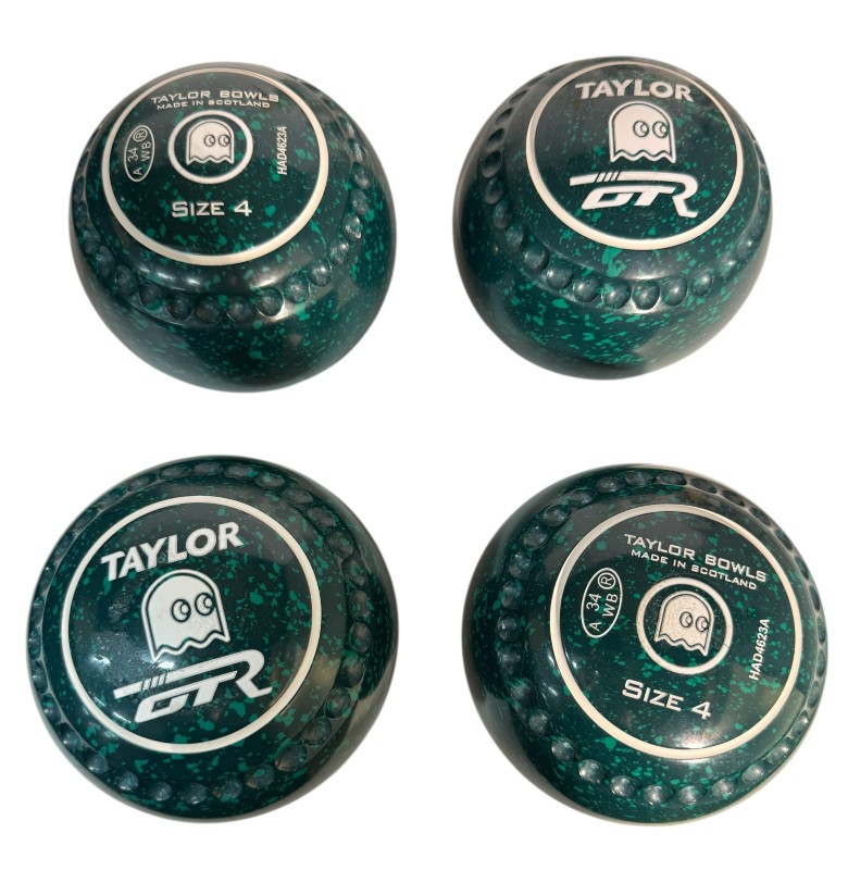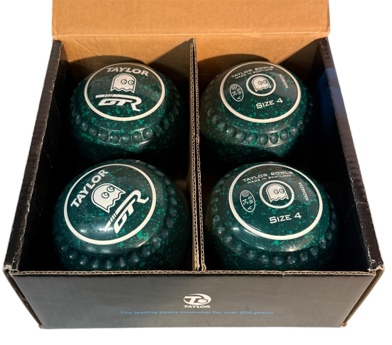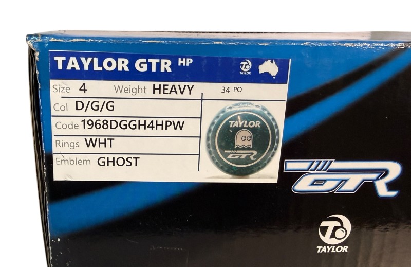 This Taylor GTR indoor lawn bowl is in excellent condition, with a striking design that features a color scheme of dark green, light green, and white rings, along with a ghost emblem. Crafted with a size 4 heavy weight, this bowl is well-suited for serious players seeking a high-quality piece of equipment. Includes the original box for storage and transport.
