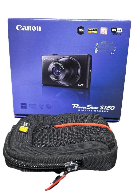 This compact Canon Powershot S120 digital camera offers 12.1 megapixels of image quality. It's a versatile option for capturing stunning photos on the go. The camera comes with the original box, charger, case, and battery, making it easy to get started right away.