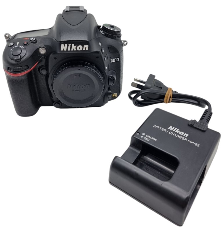 This Nikon D610 FX DSLR camera body offers impressive 24.0-megapixel performance in a full-frame format. With its advanced features and functions, it delivers exceptional image quality, even with some light cosmetic wear. The included battery and charger ensure you can keep shooting without interruption.