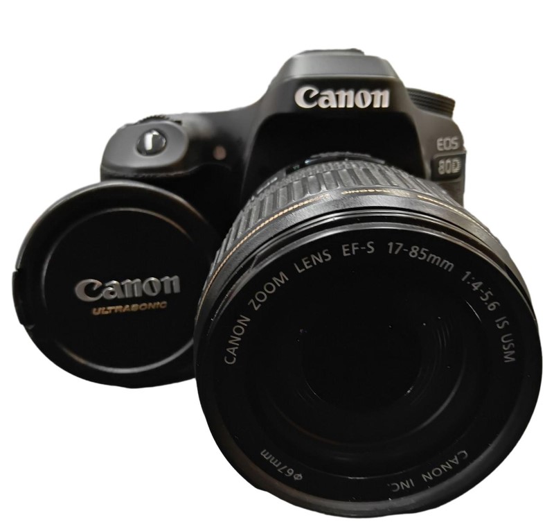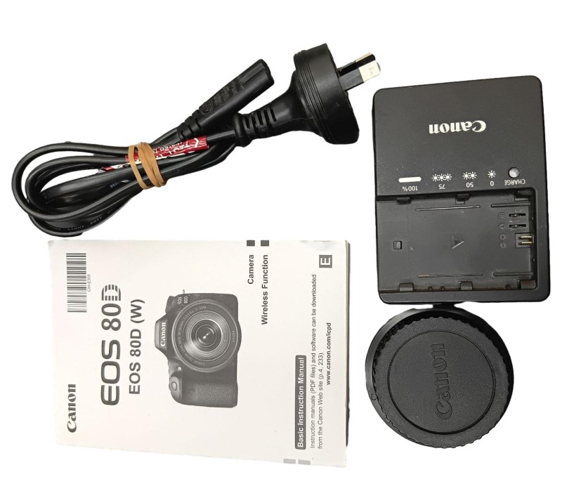 Item comes with charger , lens cap and booklet and 17-85MM Lens in picture