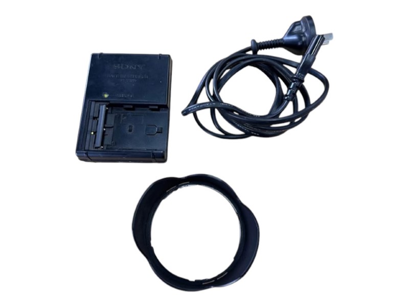Comes with a small camera bag, strap, charger, battery, and lens hood.