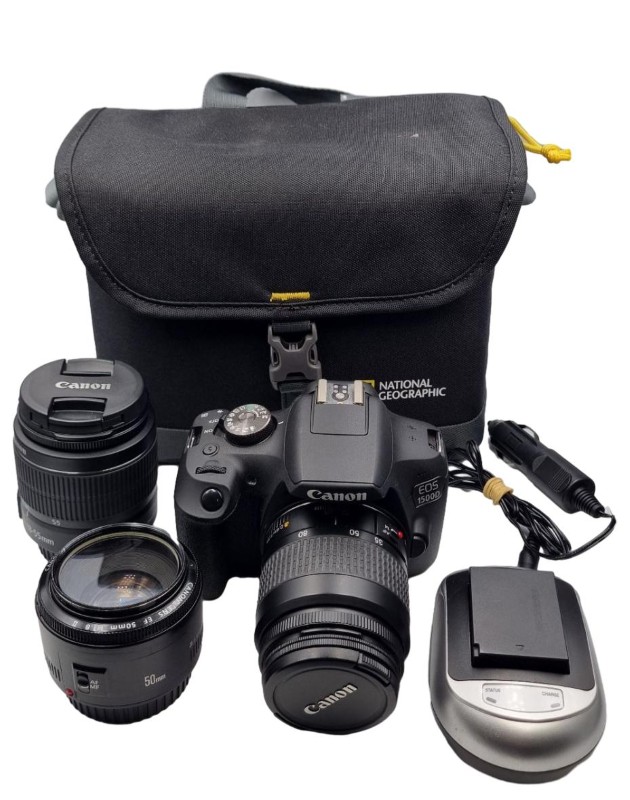 This Canon 1500D DSLR camera is a versatile and capable imaging solution, perfect for those looking to capture stunning photographs with the flexibility of interchangeable lenses. Featuring 24.1 megapixels of resolution, this camera delivers impressive image quality, even in low-light conditions. With the included bag, 2 batteries, 3 lenses, and car charger, you'll have everything you need to start your photographic journey.