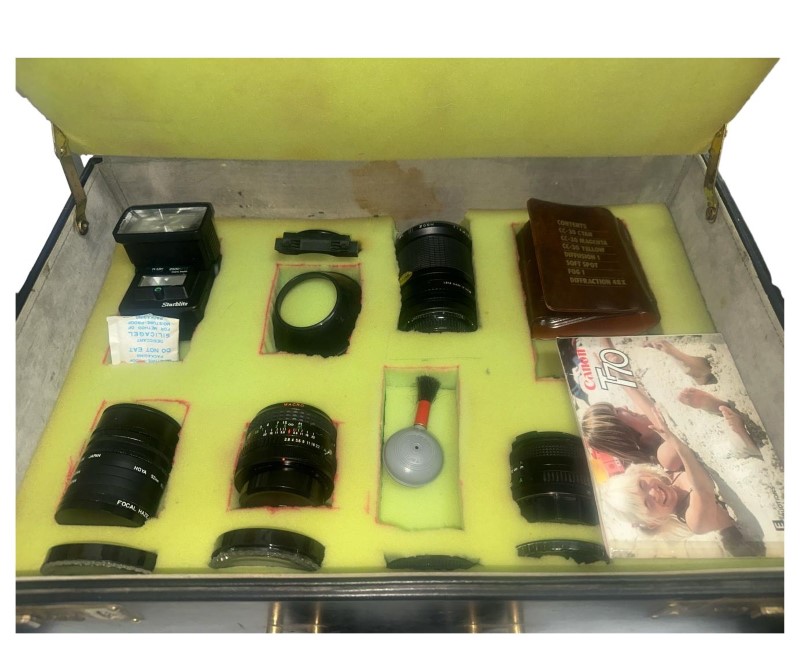Accessories: 3 camera lenses, 1 flash, manual, carry case