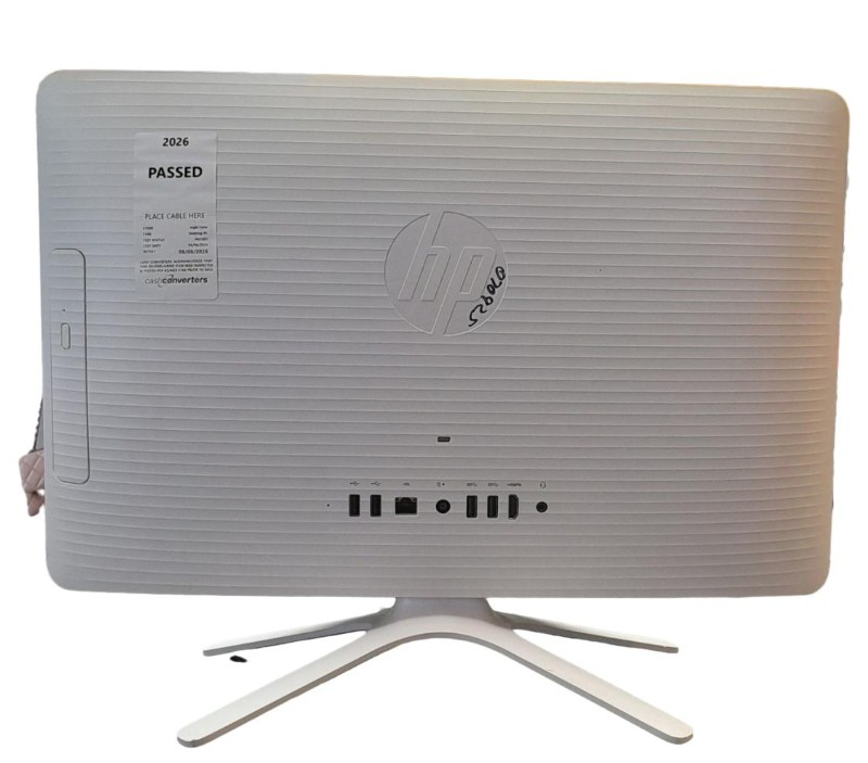 This HP 20-C416A desktop PC features an AMD E2-9000 processor with Radeon R2 graphics, 4GB of RAM, and a 1TB hard drive. It's a capable system for everyday computing tasks, with functions in good working order despite some light cosmetic wear.