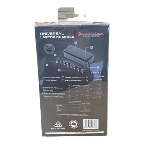 This universal laptop charger from Precision Audio is a versatile and reliable accessory for your on-the-go computing needs. Designed to work with a wide range of laptop models, it provides a convenient and efficient way to keep your device powered up wherever you go. Its compact and lightweight design makes it easy to transport, while the durable construction ensures long-lasting performance.