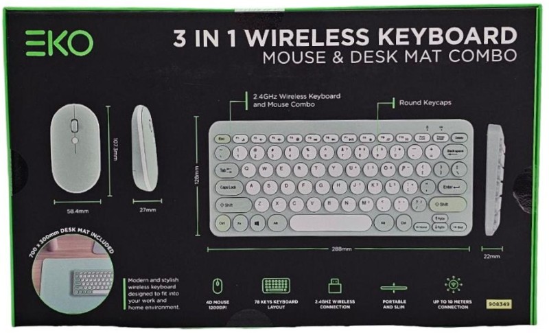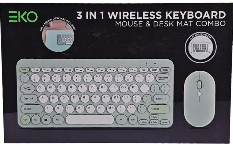 This versatile 3-in-1 wireless combo from EKO includes a keyboard, mouse, and desk mat for a complete desktop setup. The compact keyboard features a sleek, low-profile design with responsive keys for comfortable typing. The included wireless mouse provides smooth cursor control, while the durable desk mat offers a spacious work surface. This all-in-one solution is perfect for home, office, or on-the-go use.