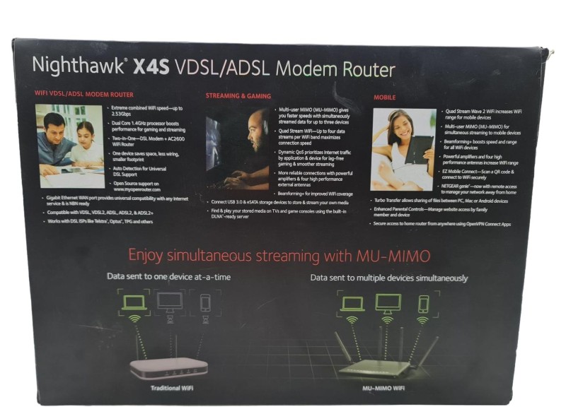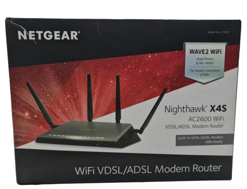 This NETGEAR NIGHTHAWK X4S D7800 modem router is a reliable and versatile networking device. Featuring advanced Wi-Fi technology, it delivers fast, stable internet connectivity throughout your home or office. While it may show light cosmetic wear from previous use, its core functions remain fully operational, ensuring you can seamlessly stream, game, and browse online.