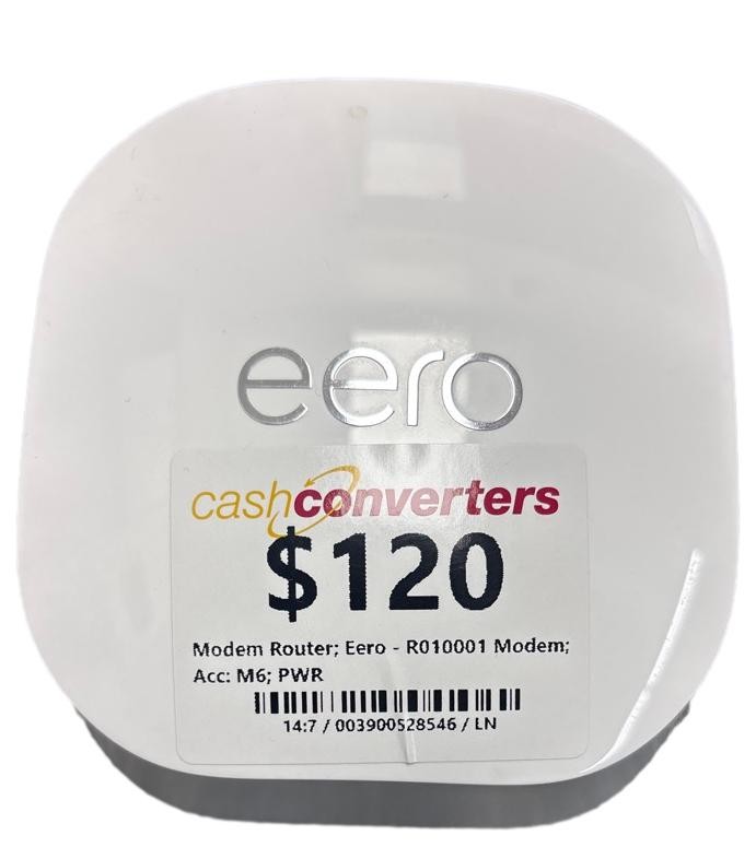 This Eero R010001 Modem is a reliable and versatile networking device that seamlessly connects your home or office to the internet. With its sleek and compact design, it blends effortlessly into any environment. The included power adapter ensures a hassle-free setup, allowing you to enjoy uninterrupted connectivity. Despite its minimal use, this modem remains in excellent condition, showcasing only very minor cosmetic wear.