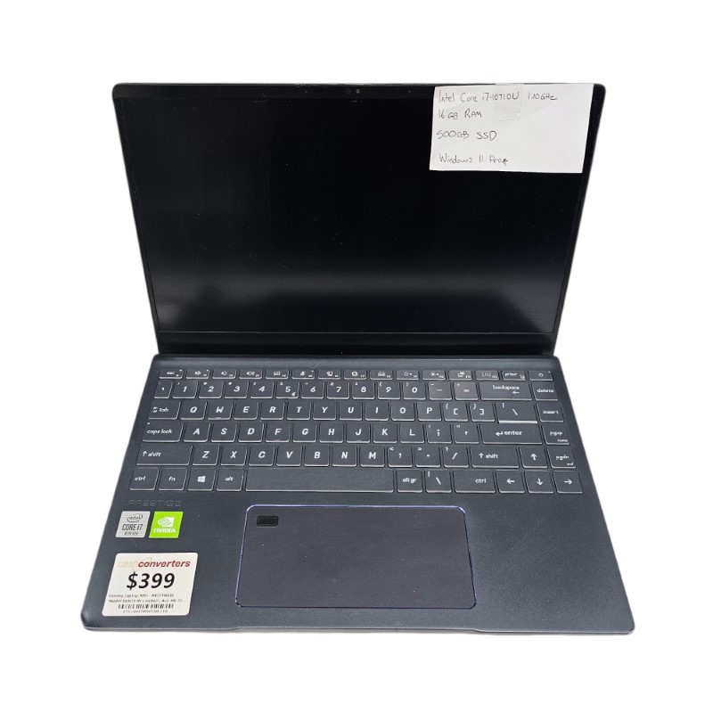 This powerful MSI gaming laptop features an Intel Core i7-10710U processor and 16GB of RAM, providing ample performance for gaming and multitasking. However, the exterior casing has sustained significant dents, indicating the laptop has experienced some wear and tear. Despite its cosmetic issues, the laptop remains functional.