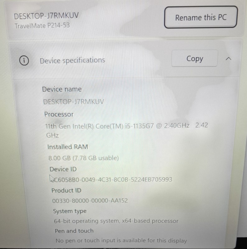 CPU Type: 11Th Gen Intel Core i5-1135G7 2.40GHz