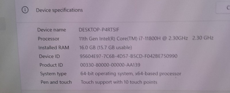 CPU Type: 11Th Gen Intel Core i7-11800H 2.30GHz