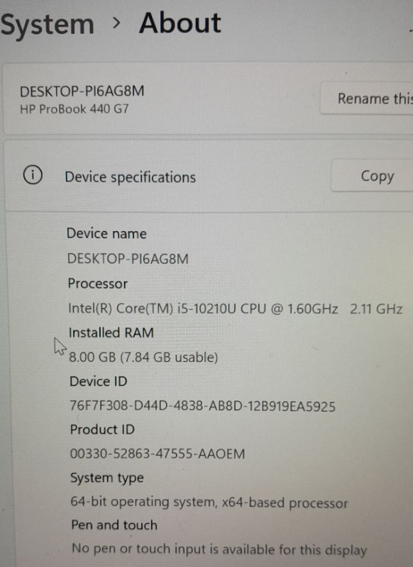 CPU Type: 10Th Gen Intel Core i5-10210U 1.60GHz