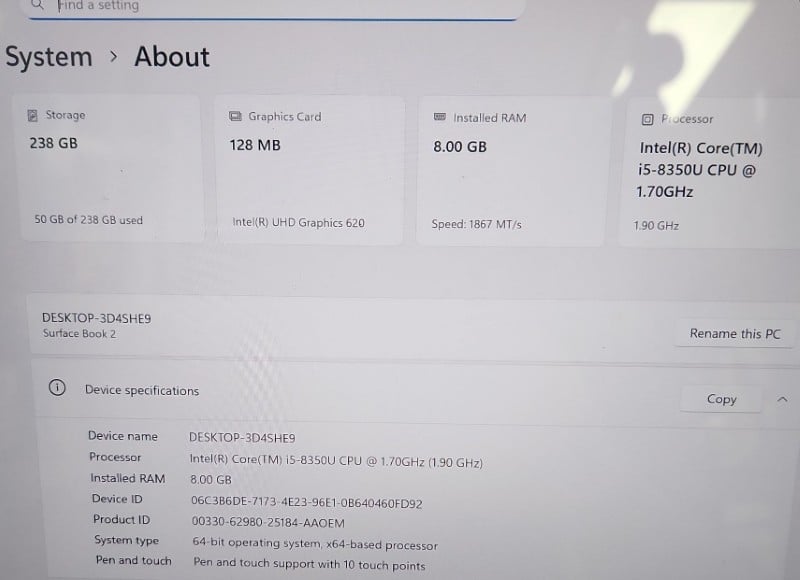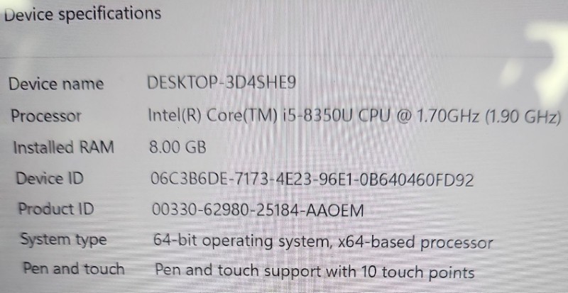 CPU Type: Intel Core i5-8350U 1.70GHz