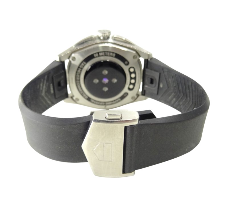 This sleek and stylish Tag Heuer Connected 42mm smartwatch is a sophisticated wearable device that seamlessly blends fashion and technology. With its 42mm case size, it offers a comfortable and versatile fit on the wrist. The plastic band provides a durable and lightweight construction, making it suitable for everyday wear.