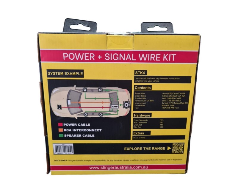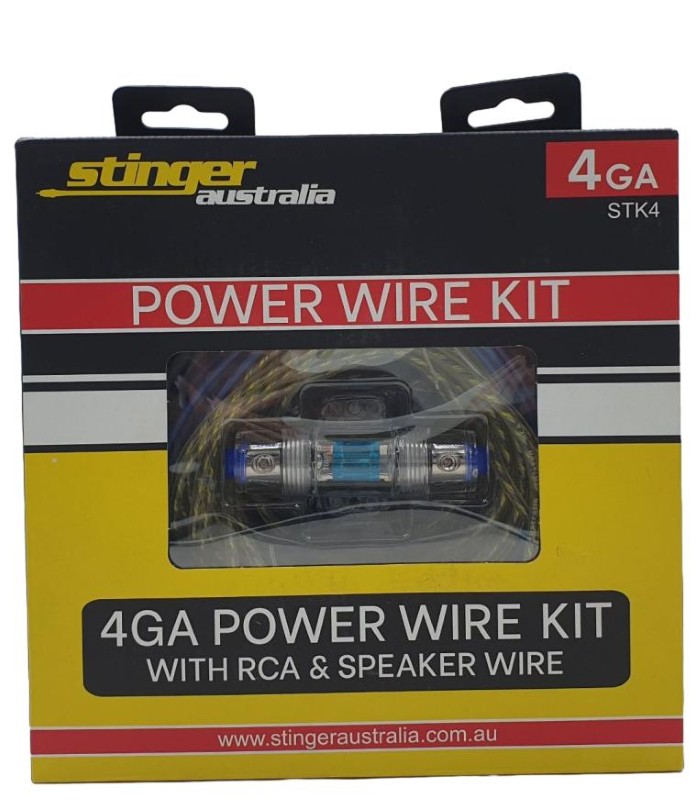 This high-quality 4GA wiring kit from the respected brand STINGER AUSTRALIA provides everything needed to power a car audio system. Featuring heavy-duty, flexible cables, this kit ensures a secure and reliable connection for optimal audio performance. The kit includes all the necessary components for a seamless installation, making it a convenient solution for upgrading your vehicle's sound system.