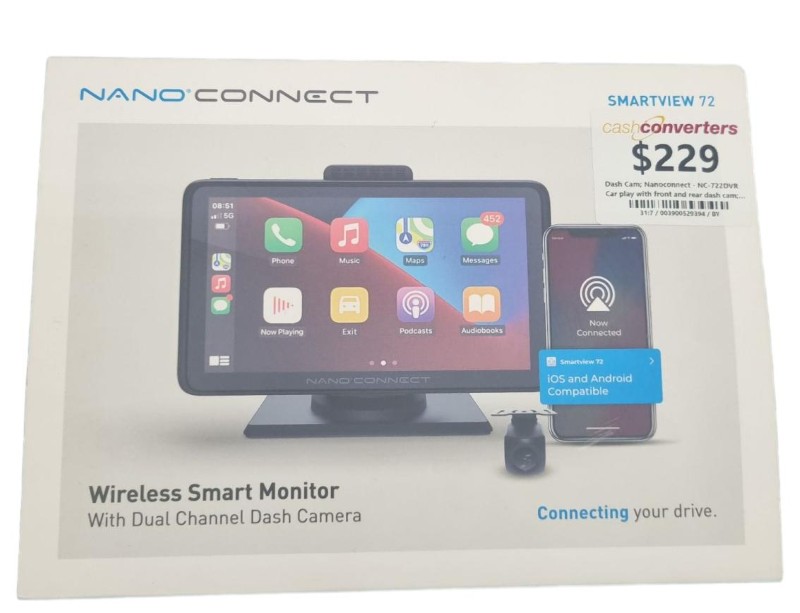 This Nanoconnect NC-722DVR car dash cam offers a comprehensive recording solution for your vehicle. With both front and rear cameras, you can capture high-quality footage of the road ahead and behind. The included accessories, such as the power cable, window mount, and rear camera, provide a complete setup for seamless installation and use. Despite some minor signs of wear, this dash cam remains in good condition and ready to provide reliable video documentation of your journeys.