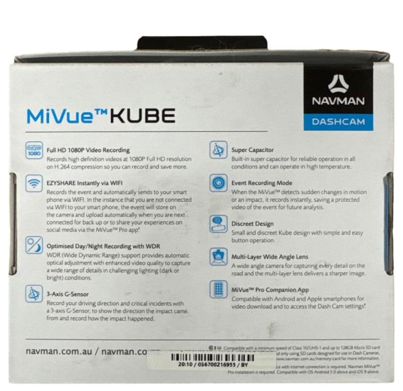 This versatile NAVMAN MIVUE KUBE dash cam is a reliable companion for your driving journeys. With its compact and discreet design, it seamlessly integrates into your vehicle's interior, capturing important moments on the road. Featuring high-quality video recording, this dash cam ensures you have evidence in the event of an incident. Its user-friendly interface makes it easy to operate, providing peace of mind as you navigate the roads.