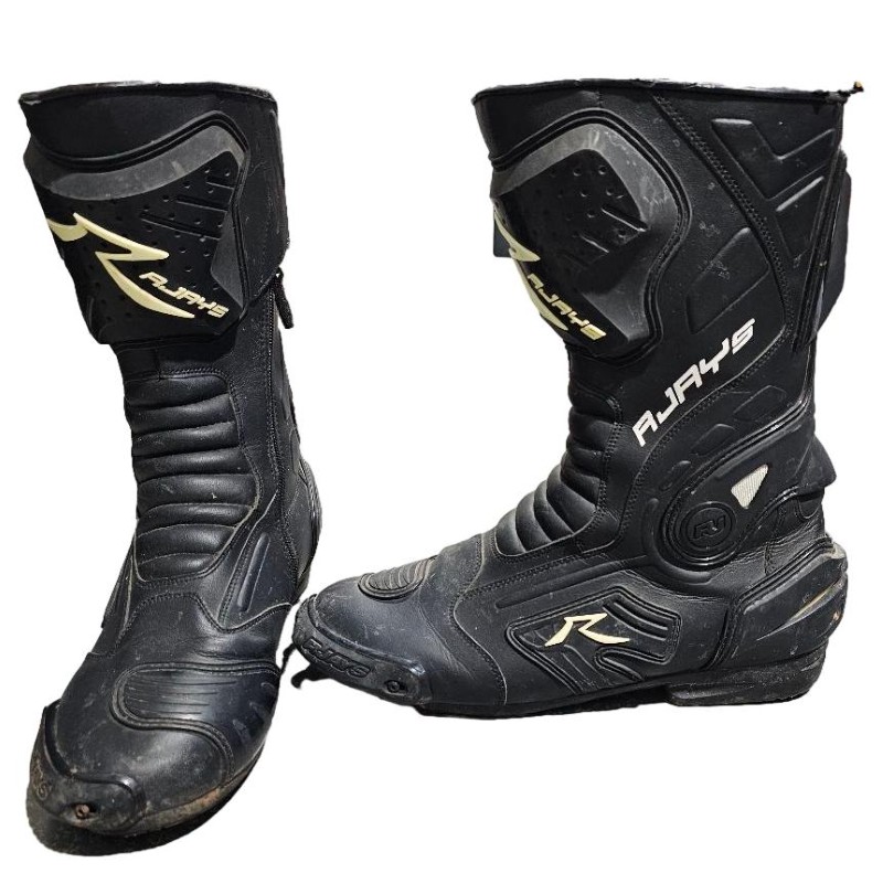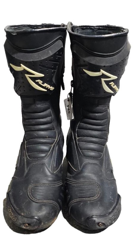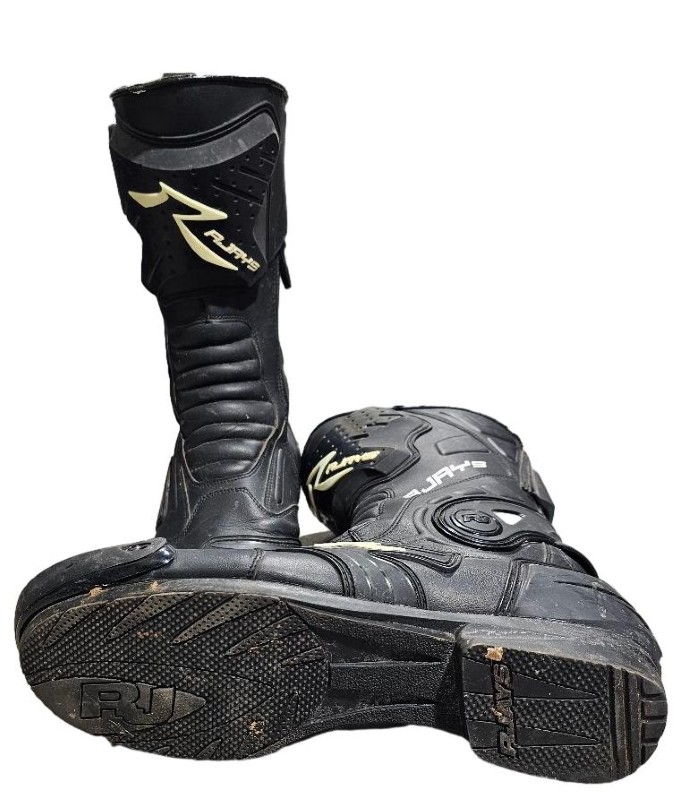 This pair of RJays motorcycle boots are in good condition with little sign of wear. They are a practical and stylish choice for riders, offering protection and comfort on the road. These boots feature a durable construction and a secure fit to keep your feet safe and supported during your journeys.