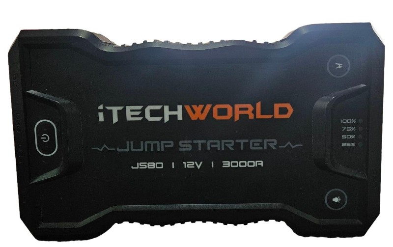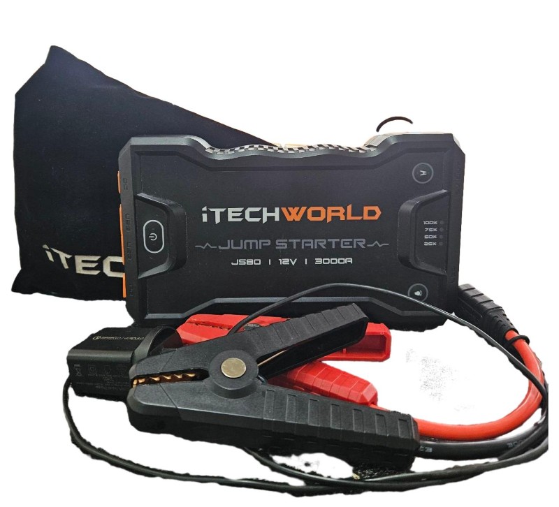 This robust Itech world JS80 jump starter is a reliable companion for keeping your vehicle's battery charged and ready to go. With its red and black cables, charger and cords, and included booklet, this versatile unit is easy to use and packed with essential features.