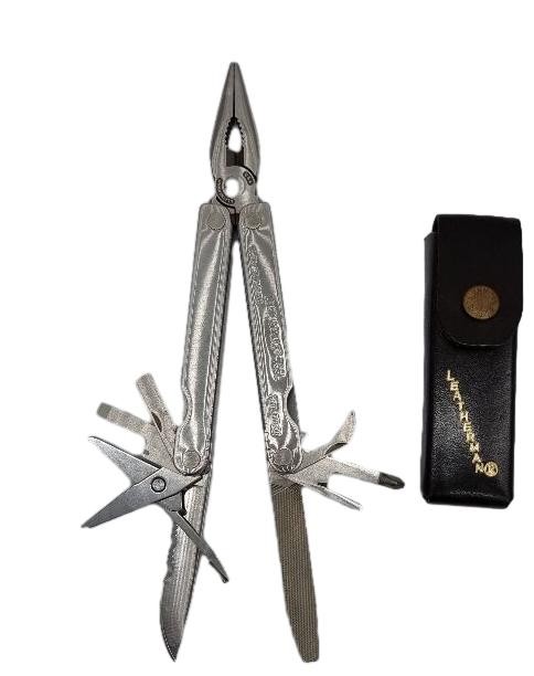 This versatile Leatherman multi-tool is a practical companion for a variety of tasks. It features an array of essential tools, including pliers, scissors, and a knife, all housed in a compact and durable design. The included leather pouch provides a convenient way to keep the multi-tool secure and accessible.