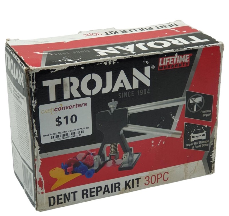 This TROJAN DENT REPAIR KIT is a versatile hand tool designed to remove dents and dings from a variety of surfaces. Featuring a sturdy construction and a range of attachments, this kit allows you to tackle a wide array of dent repair tasks with ease. With little sign of wear, this item remains in good condition, ready to help you restore your vehicle's or other surface's appearance.