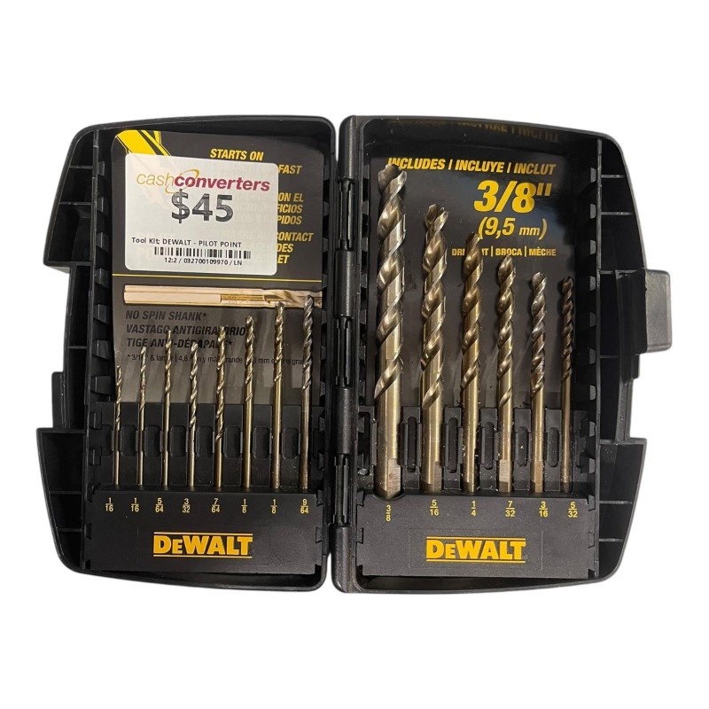 This DEWALT PILOT POINT tool kit is a versatile collection of hand tools suitable for a variety of tasks. Crafted with precision and durability, this set features high-quality components designed to deliver reliable performance. With minimal signs of wear, this kit remains in good condition, ready to assist you in your projects. A practical and dependable choice for the modern workshop or home toolbox.