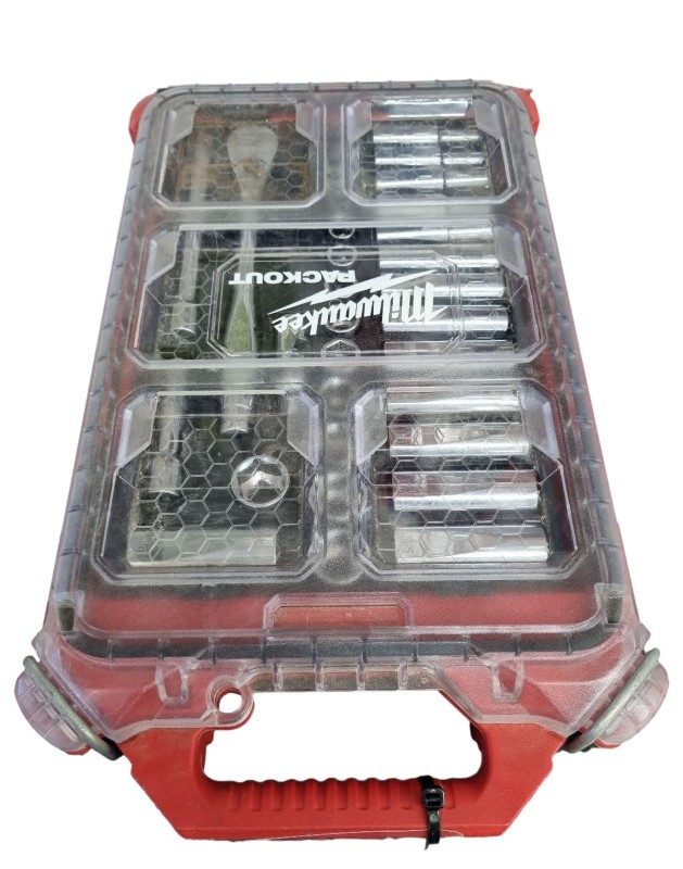 This Milwaukee Packout socket set has been well used but remains in working condition. The set includes a variety of sockets to tackle a range of tasks. With its durable construction and versatile design, this socket set is a reliable addition to any tool collection.