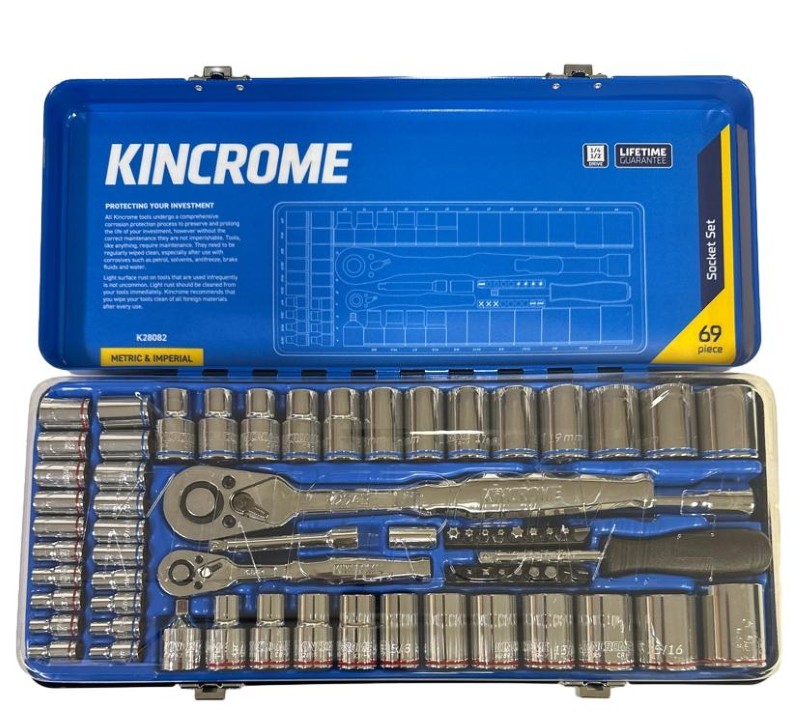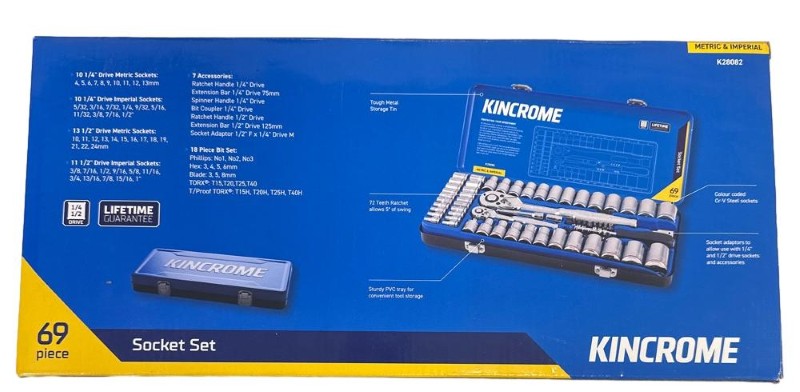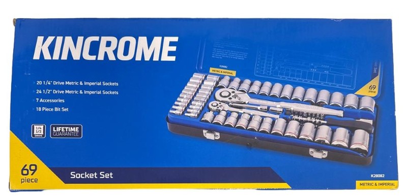 This premium 69-piece socket set from renowned brand KINCROME is an exceptional choice for any toolbox. Featuring a comprehensive range of sockets in both metric and imperial sizes, this set offers unparalleled versatility to tackle a wide variety of fastening tasks. Crafted from durable chrome vanadium steel, these sockets deliver reliable performance and long-lasting use. The included ratchet and extension bars provide added convenience and accessibility, making this an essential addition to any home or workshop.