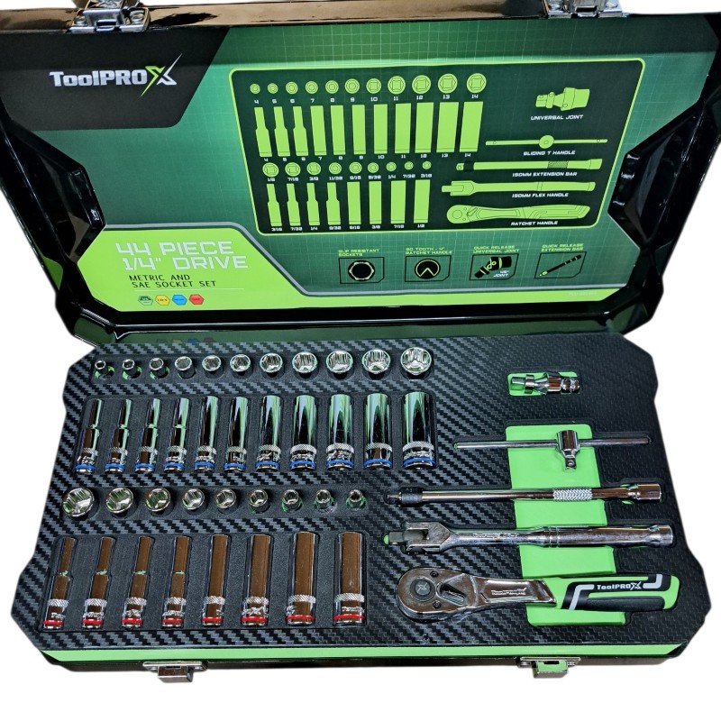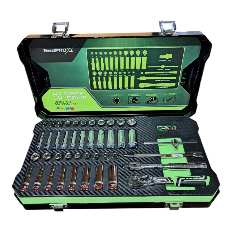 This high-quality 44-piece socket set from the renowned Tool Pro x brand is a versatile and reliable addition to any toolbox. Crafted with precision, it features a comprehensive range of sockets in various sizes to tackle a diverse array of projects with ease. The set is in good condition, with minimal signs of wear, ensuring long-lasting performance.