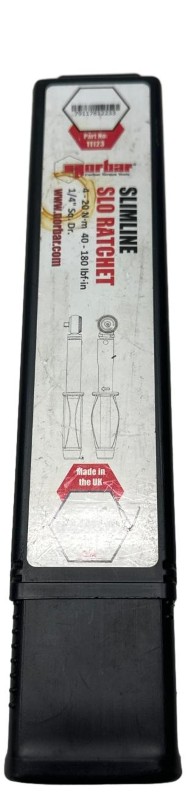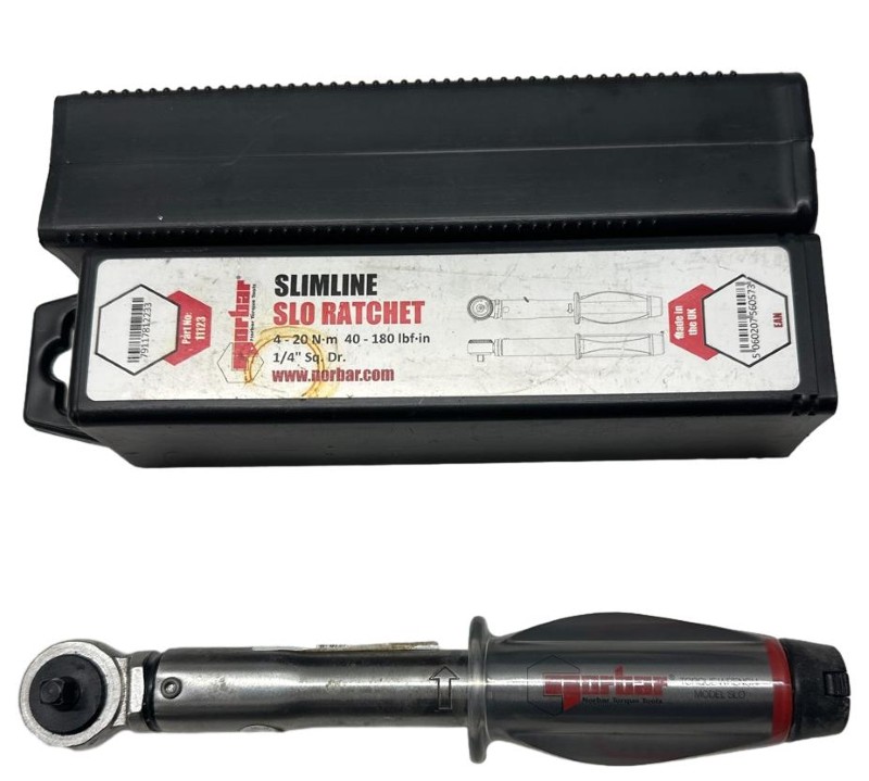 This NORBAR SLIMLINE SLO RATCHET 4-20NM 1/4" DRIVE torque wrench is a reliable and versatile hand tool. Its slimline design allows for easy access in tight spaces, while the 4-20Nm torque range makes it suitable for a variety of applications. The ratcheting mechanism provides smooth and efficient operation. This pre-owned tool has been well-used but remains in working condition.