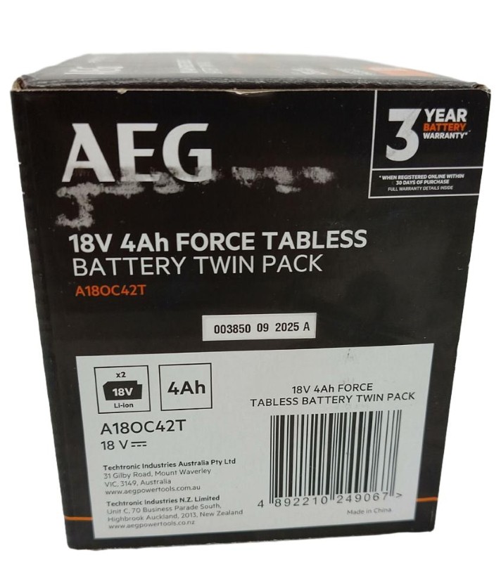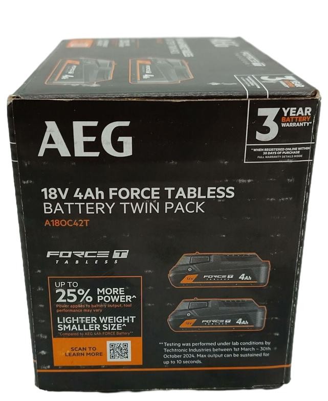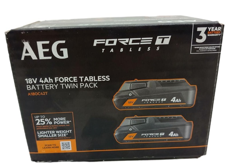 This AEG A18OC42T Twin 18V 4Ah FORCE TABLESS Battery Pack is a powerful and reliable cordless tool battery. Featuring a 18V voltage and 4.0Ah capacity, it provides extended runtime and performance for your AEG cordless power tools. Designed with a tabless construction for improved safety and durability, this battery pack delivers consistent power and dependable operation.