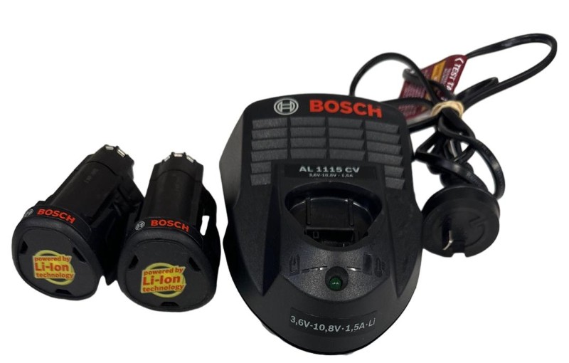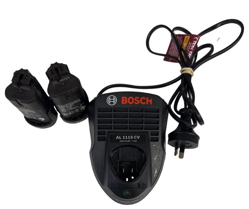 This BOSCH BATTERY CHARGER WITH 2X 1.3AMP BATTERY is a versatile cordless tool accessory. Featuring an 8V voltage, it comes with two 1.3AMP batteries to power your BOSCH cordless tools. The batteries and charger are in good condition with little sign of wear, ensuring reliable performance.