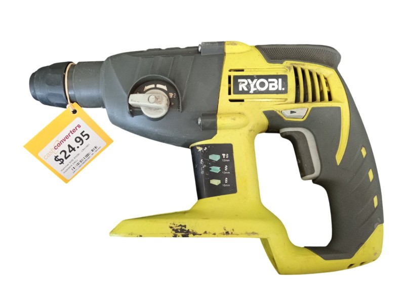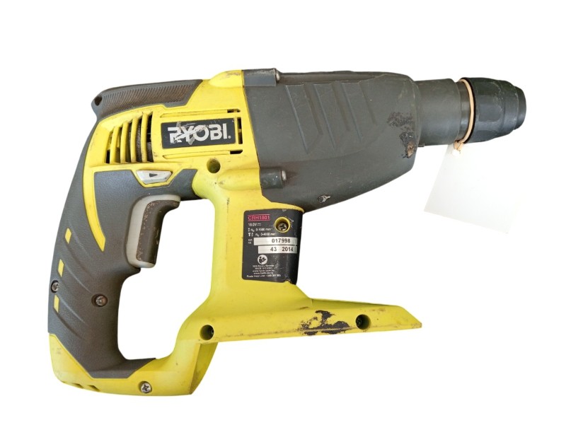 This RYOBI CRH1801 HAMMER DRILL is a powerful cordless tool that can handle a variety of drilling tasks. With its hammer function, it's ideal for drilling into masonry and concrete. As a skin-only model, it comes without a battery or charger, making it a cost-effective option for those who already have compatible RYOBI batteries. Despite signs of heavy use, this hammer drill remains a reliable and capable power tool.