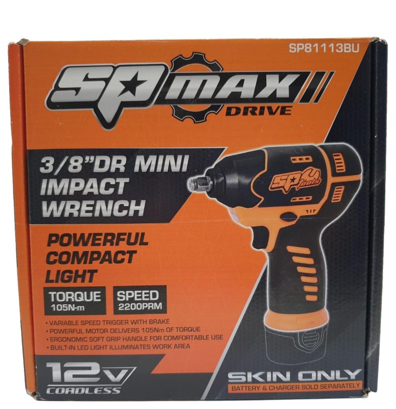 This compact and powerful SP MAX DRIVE 3/8" DR MINI IMPACT WRENCH is an excellent choice for a wide range of fastening tasks. Featuring a robust design and a high-torque motor, it delivers impressive performance in a convenient, portable package. Whether you're working on automotive repairs, construction projects, or DIY home improvements, this impact driver will get the job done efficiently and effectively.