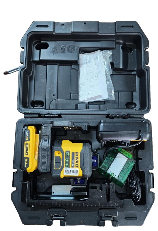 This compact 3x360 line laser from DeWalt is a versatile power tool that can streamline your construction or renovation projects. With its 360-degree horizontal and vertical lines, it provides precise alignment and levelling capabilities. The rechargeable battery ensures cordless convenience, while the included case, attachments, and manual make it easy to transport and use. This laser level is in good condition with little sign of wear, ready to assist you in your work.