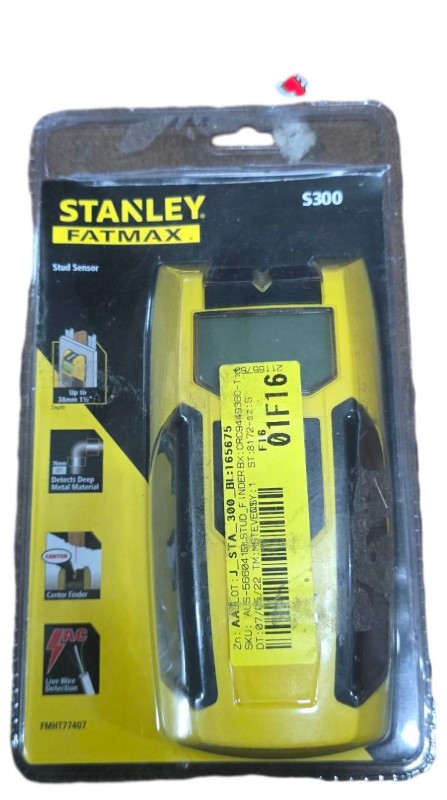 This Stanley FATMAX S300 stud finder is a reliable tool for locating studs, joists, and other concealed objects behind walls. Its advanced sensors can detect wood, metal, and live electrical wires, helping you work safely and efficiently. The ergonomic design and clear LCD display make it easy to use, while the durable construction ensures long-lasting performance.