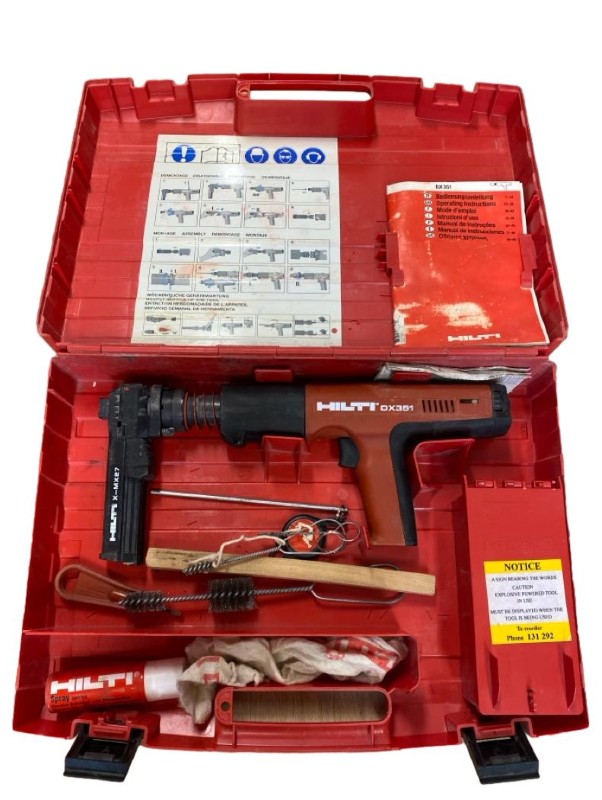 This powerful cordless nail gun from HILTI, the DX351 model, is a versatile tool that can tackle a wide range of construction and DIY projects. Featuring air-powered operation, it delivers reliable and consistent performance. With its cordless design, you'll enjoy the freedom to work without being tethered to a power source. This well-used nail gun has been kept in good working condition and comes with the original box and accessories.