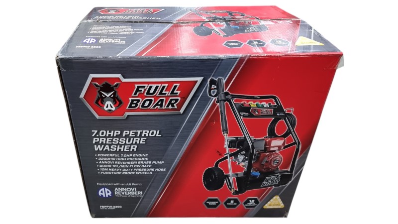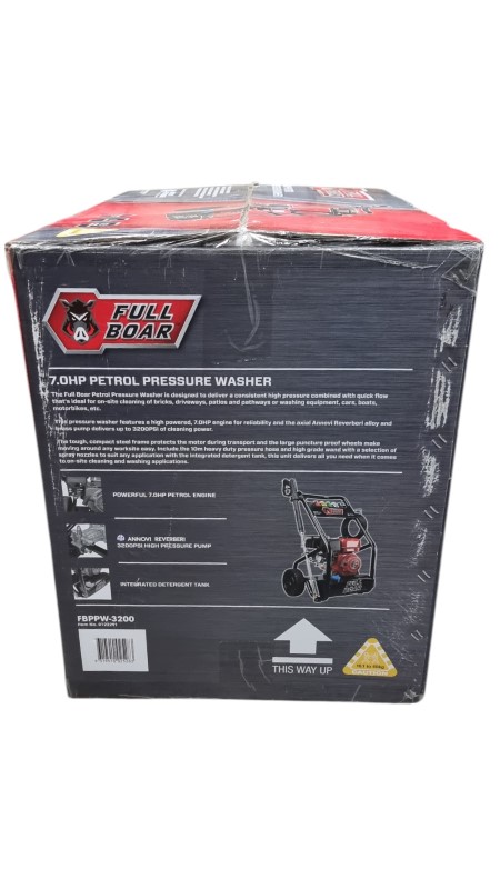 This powerful 3200PSI petrol pressure washer from Full Boar delivers exceptional cleaning performance for a wide range of outdoor tasks. Equipped with a robust 7HP engine, it generates impressive water pressure to tackle even the toughest grime and dirt with ease. Versatile and durable, this pressure cleaner is an essential tool for home, garden, and vehicle maintenance.
