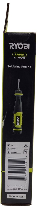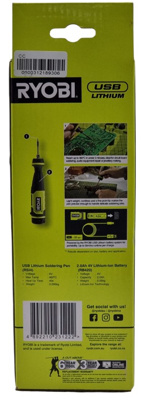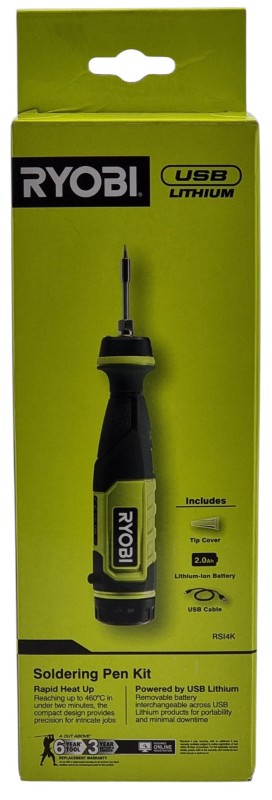 This Ryobi RSI14K Soldering Pen Kit is a versatile and convenient electric soldering tool. Featuring a cordless design powered by a 4V battery, it offers the freedom to work without being tethered to a power source. The soldering pen is well-suited for a variety of electronic repairs and DIY projects, making it a valuable addition to any toolkit.