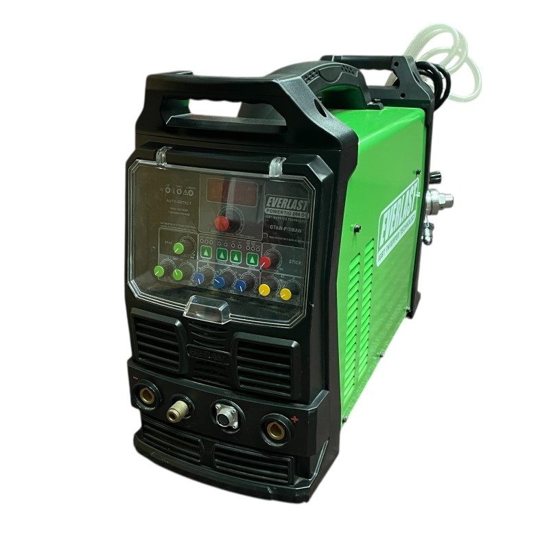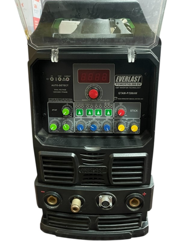 This EVERLAST POWERTIG 200 DV TIG Welder is a reliable and versatile power tool for industrial welding tasks. It features a dual voltage input of 120V/240V, allowing for greater flexibility in usage. The low 5 Amp start for TIG in DC and 20 Amp in AC ensures precise control and stability during welding. The pre-flow and post-flow control provide maximum shielding gas protection for high-quality welds. This welder is in good used condition with minimal wear, making it a dependable choice for your industrial welding needs.
